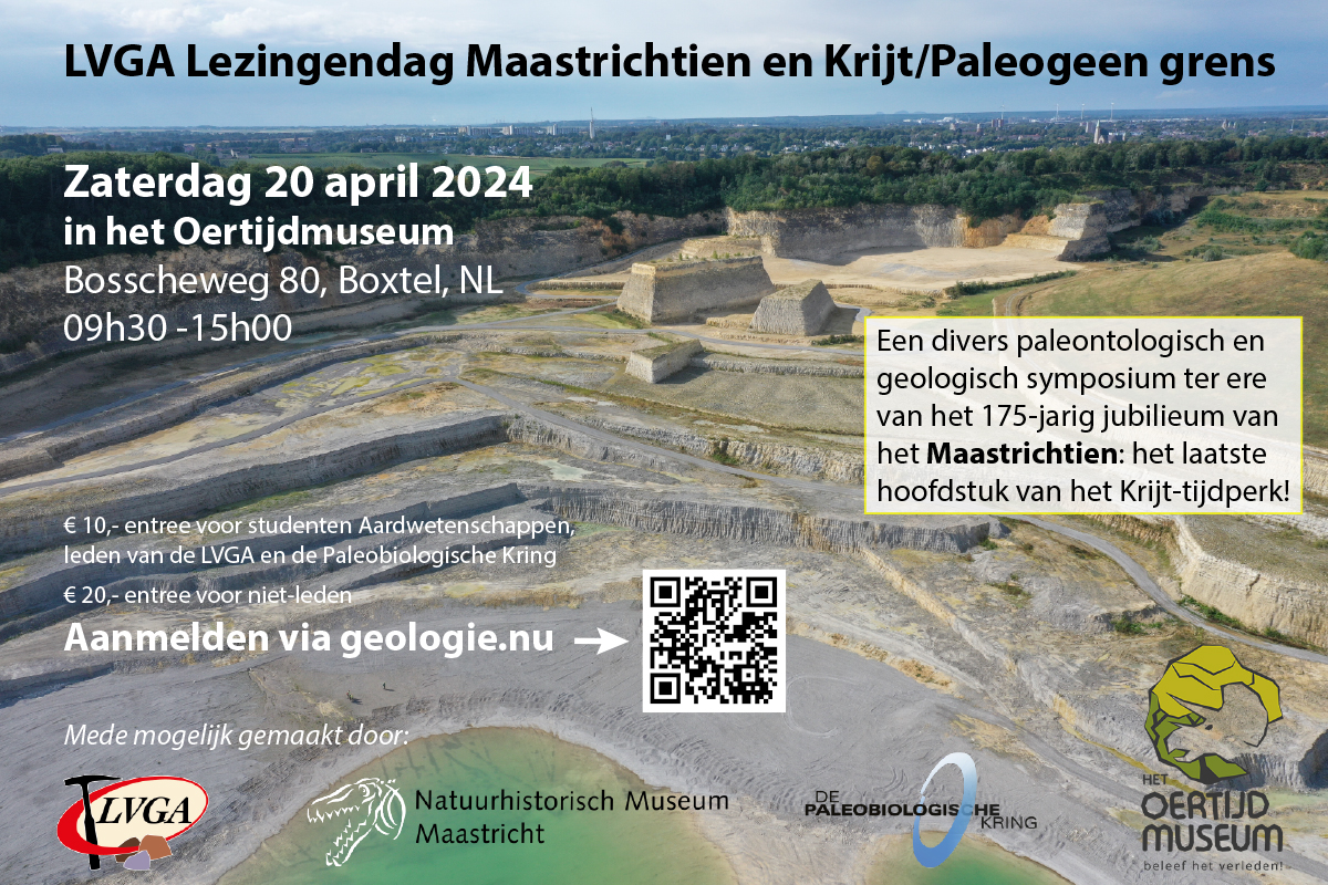 Zaterdag 20 april 2024 staat in het teken van het Maastrichtien en komen Mosasaurus, krabben, nautilussen, haaien en nog veel meer aan bod in diverse korte voordrachten door specialisten. Afgesloten wordt met het abrupte einde van het Maastrichtien, rond 66 miljoen jaar geleden – de inslag van de meteoor die 75 procent van alle leven op aarde de das omdeed.